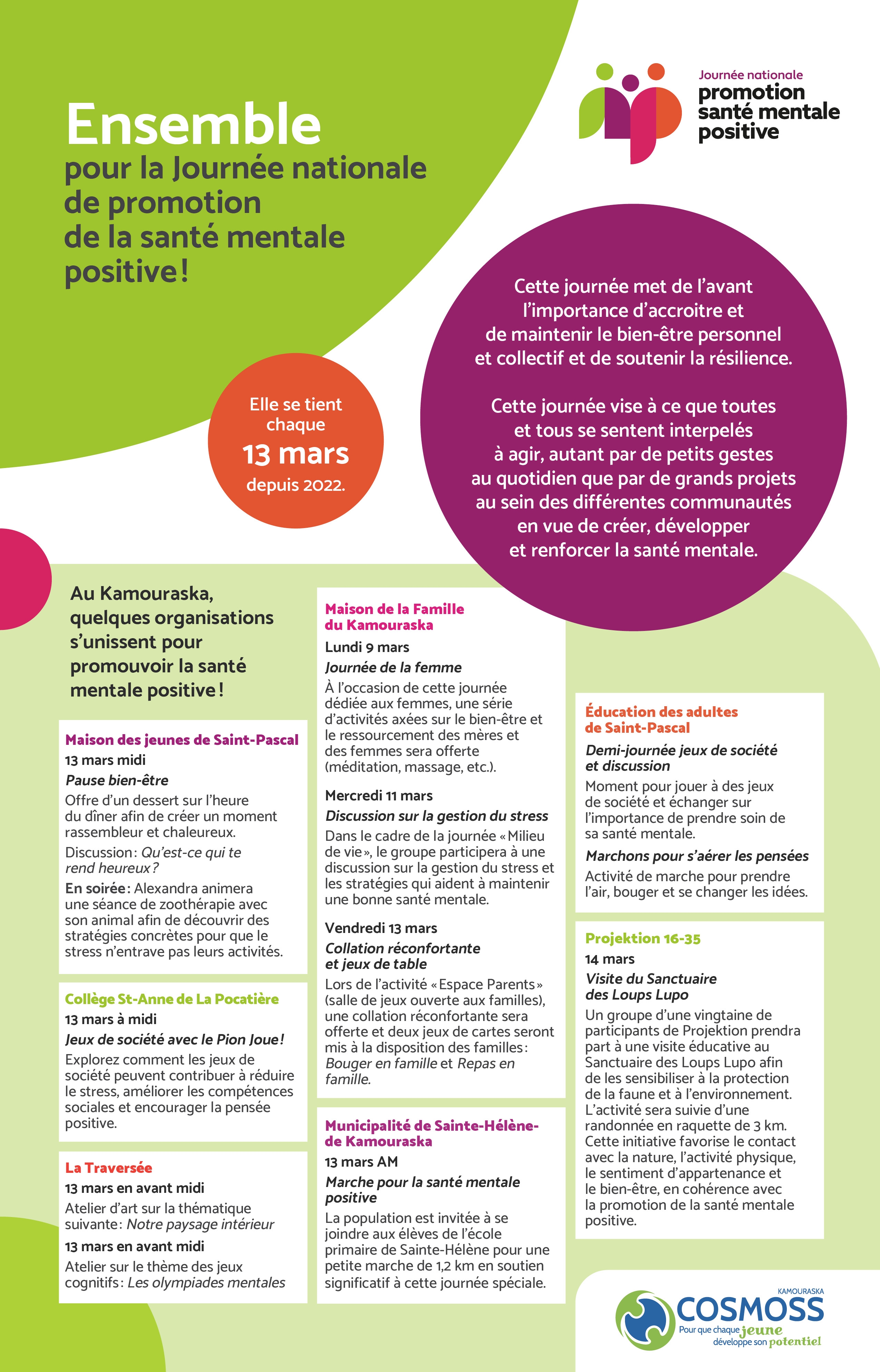 Le 13 mars, les partenaires COSMOSS mettent de l’avant l’importance d’accroitre et de maintenir le bien-être personnel et collectif et de soutenir la résilience.