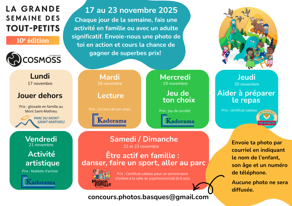 du 17 au 23 novembreLa Grande semaine des tout-petits est l'occasion pour les partenaires de la Démarche COSMOSS de susciter le dialogue sur l'état de bien-être et de développement des enfants, de mettre en lumière des initiatives qui soutiennent la petite enfance et de mobiliser l’ensemble de la société.