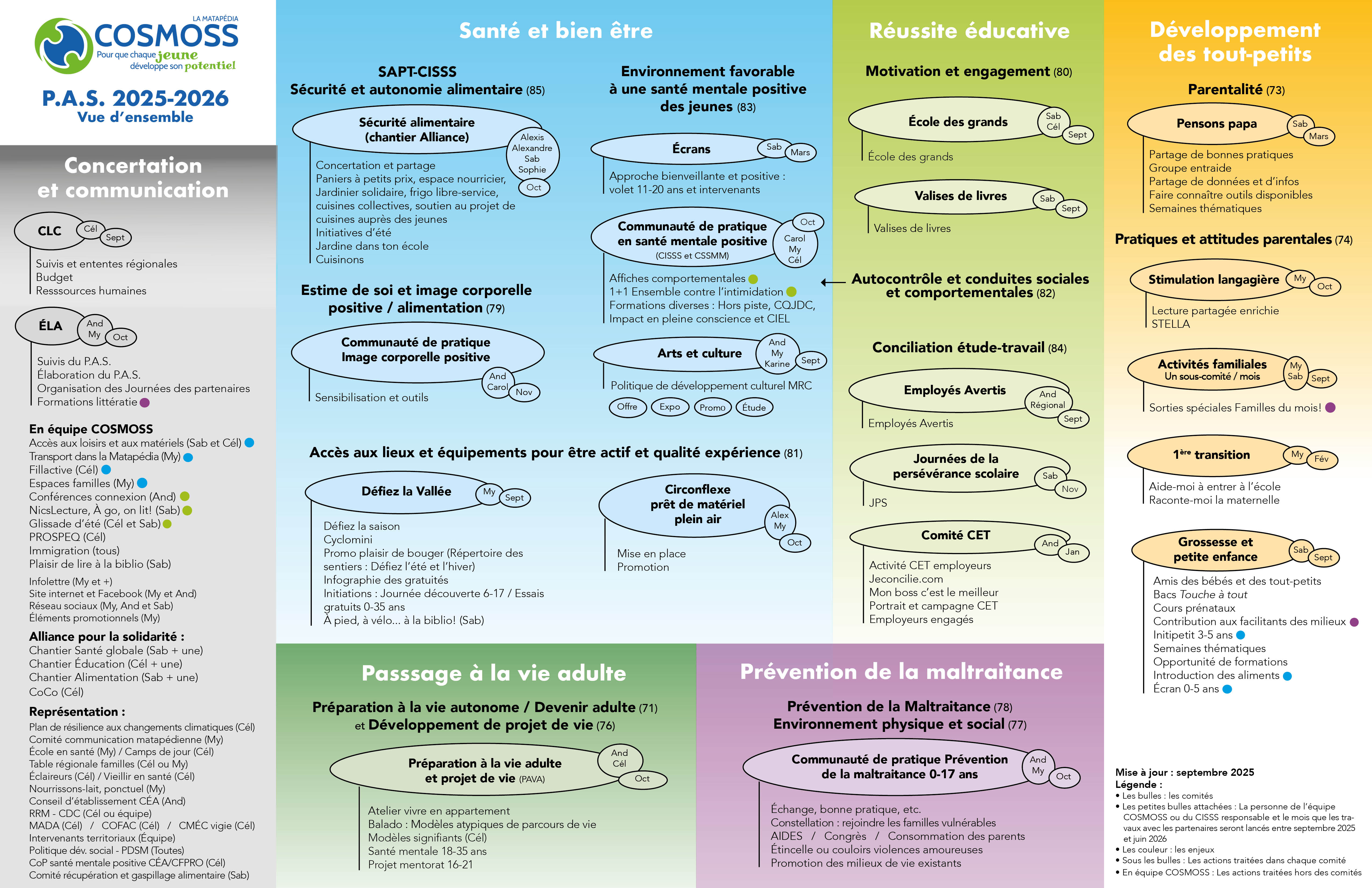 - Par les petites bulles : La personne de l'équipe COSMOSS ou du CISSS responsable de l'action et le mois où les travaux avec les partenaires seront lancés (d'août 2025 à juin 2026)