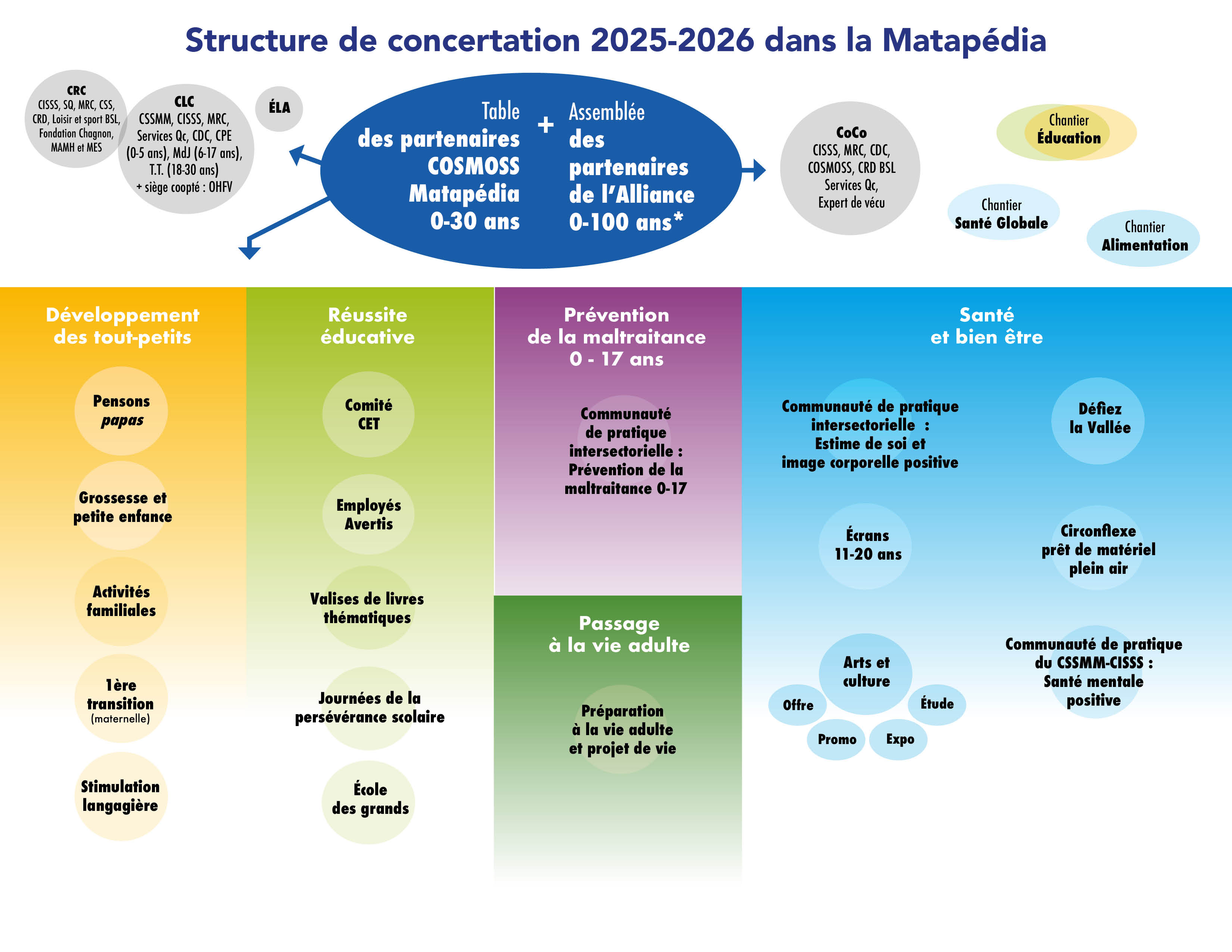 COSMOSS Matapédia est sous la gouverne d’un Comité local de coordination (CLC) composé de partenaires des réseaux de la santé, de l’éducation, de l'emploi, de la petite enfance, du monde municipal et du milieu communautaire. Ces partenaires s’engagent à assurer une plus grande cohésion et complémentarité des services destinés aux jeunes et aux familles.