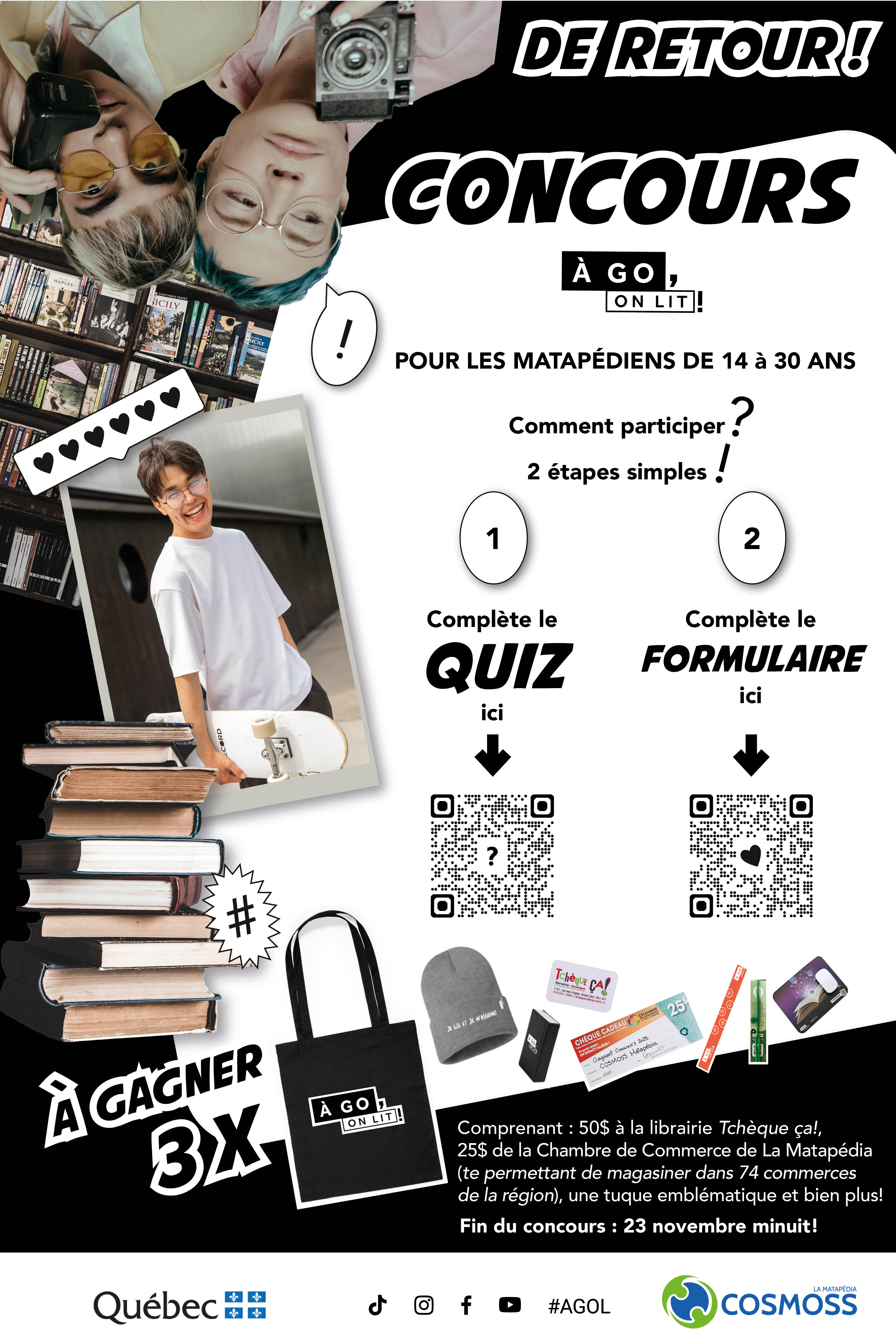 La Vallée de la Matapédia s'est mobilisée pour la 8e édition de la campagne À GO, on lit! , un mouvement collectif qui invite nos jeunes à découvrir le plaisir de la lecture. Pour soutenir cette inititative, nous avons mis à disposition des outils précieux pour les bibliothèques, les intervenants d'organismes communautaires et les professeurs. Ces ressources incluent un concours local stimulant, ainsi que des recueils d'activités adaptés aux mentors de la lecture conçus par AGOL. Voir plus bas!