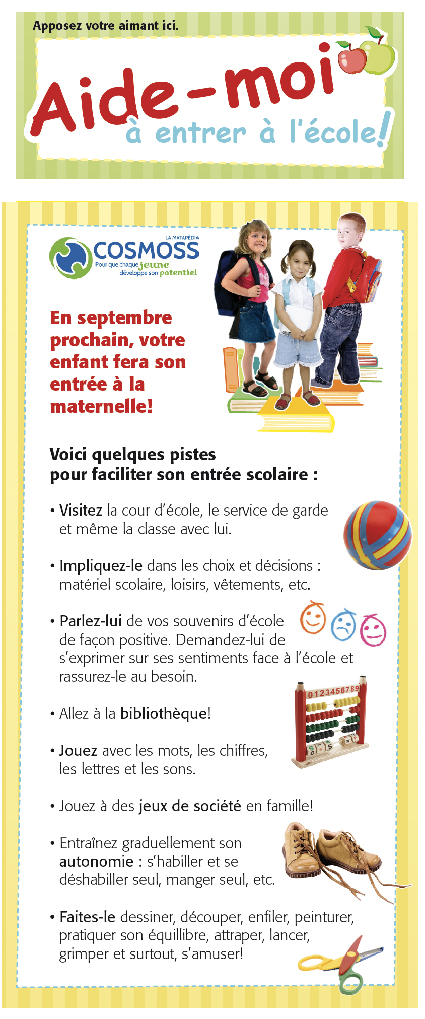La démarche Aide-moi à entrer à l’école! accompagne les enfants entrant à la maternelle (et leurs parents!) dès l'inscription et tout au long de leur intégration, soit jusqu'à la fin de la maternelle. Le tout afin de favoriser une entrée scolaire réussie!