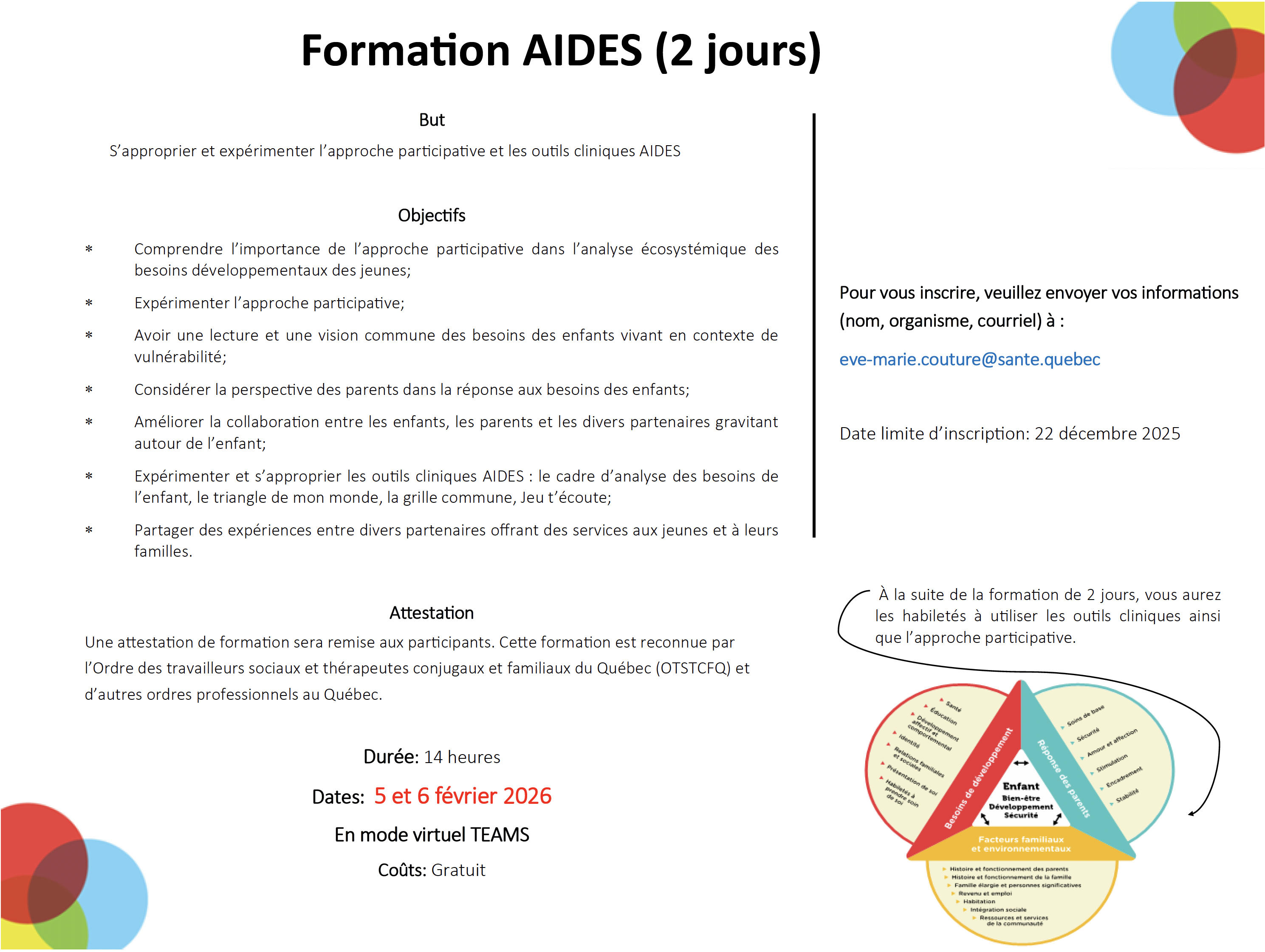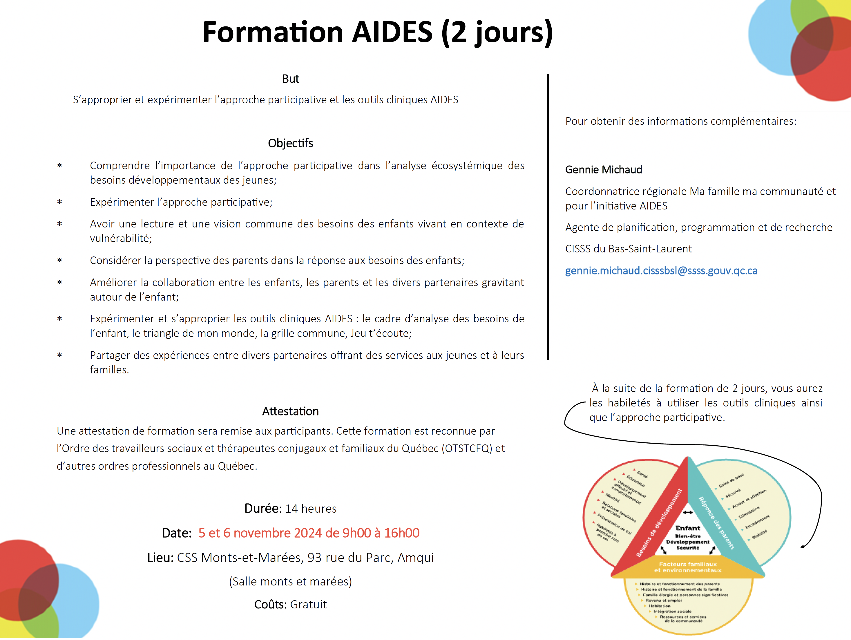 L'initiative AIDES est une pratique d’intervention novatrice destinée aux enfants et à leur famille vivant dans un contexte de vulnérabilité, et qui reçoivent des services de plusieurs organisations. L’initiative vise l’articulation cohérente des actions autour des besoins des enfants.