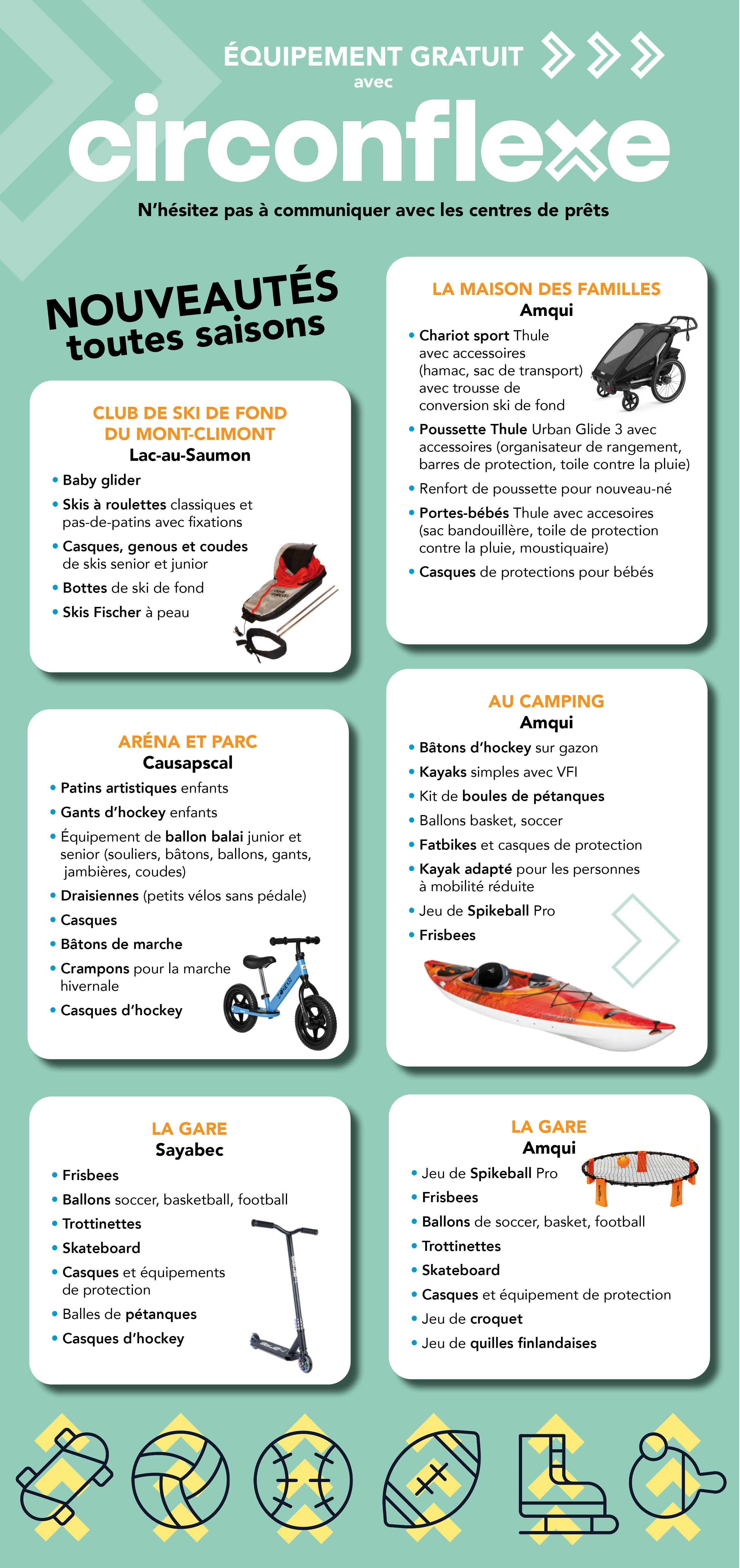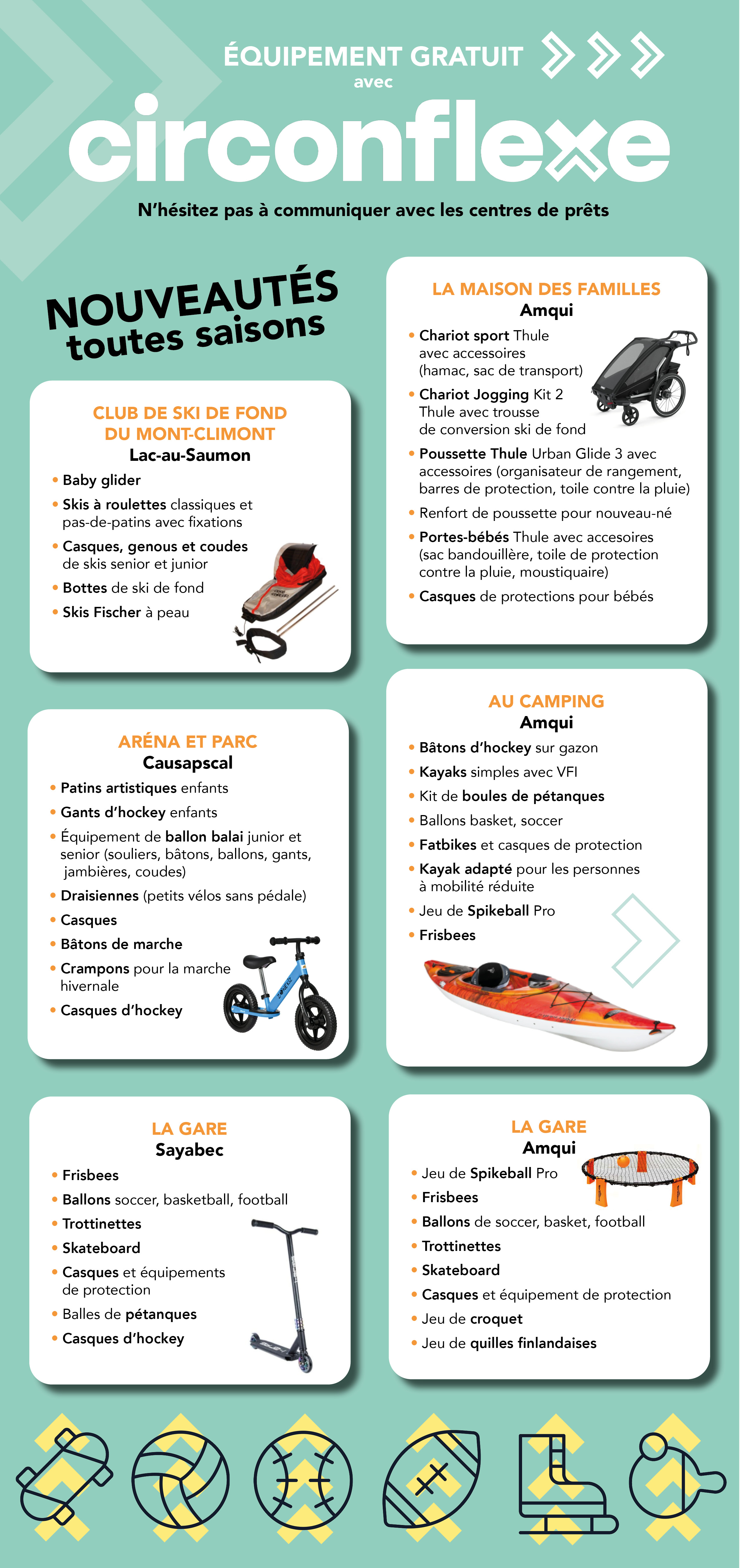 CIRCONFLEXE a pour mission de permettre une meilleure accessibilité à des équipements, notamment par la mise en place de points de service qui rendent accessible gratuitement du matériel durable et sécuritaire, afin d’augmenter et de favoriser de façon durable la pratique régulière d’activités physiques, sportives et récréatives sur l’ensemble du territoire.