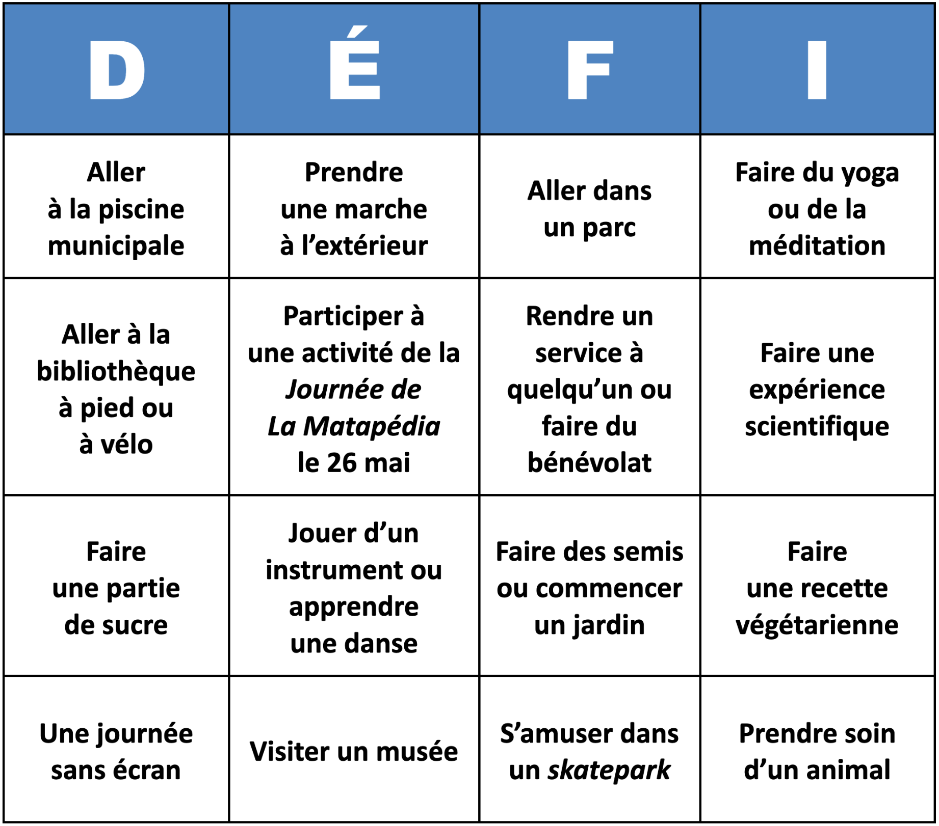 - Faire des activités proposées seul ou en famille! Tout le monde peut participer, petit et grand!