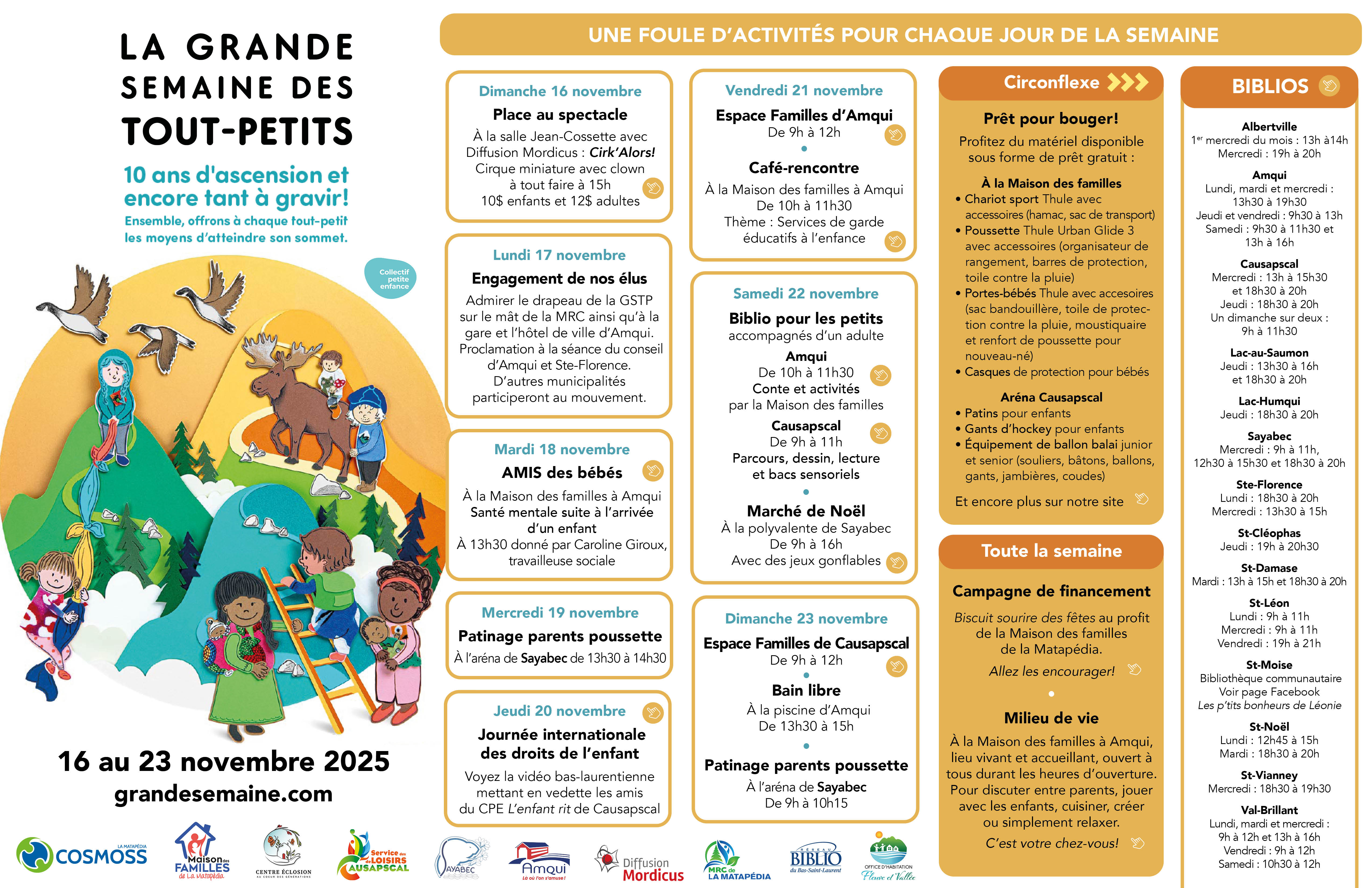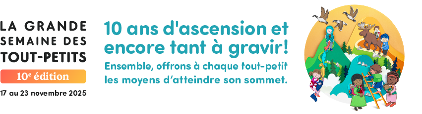 Initié au Québec par les partenaires nationaux, la Grande semaine des tout-petits est un mouvement national se déroulant pendant la semaine marquant la Journée mondiale de l’enfance* et vise la sensibilisation et la mobilisation sociétale en faveur de la petite enfance et de la périnatalité.
