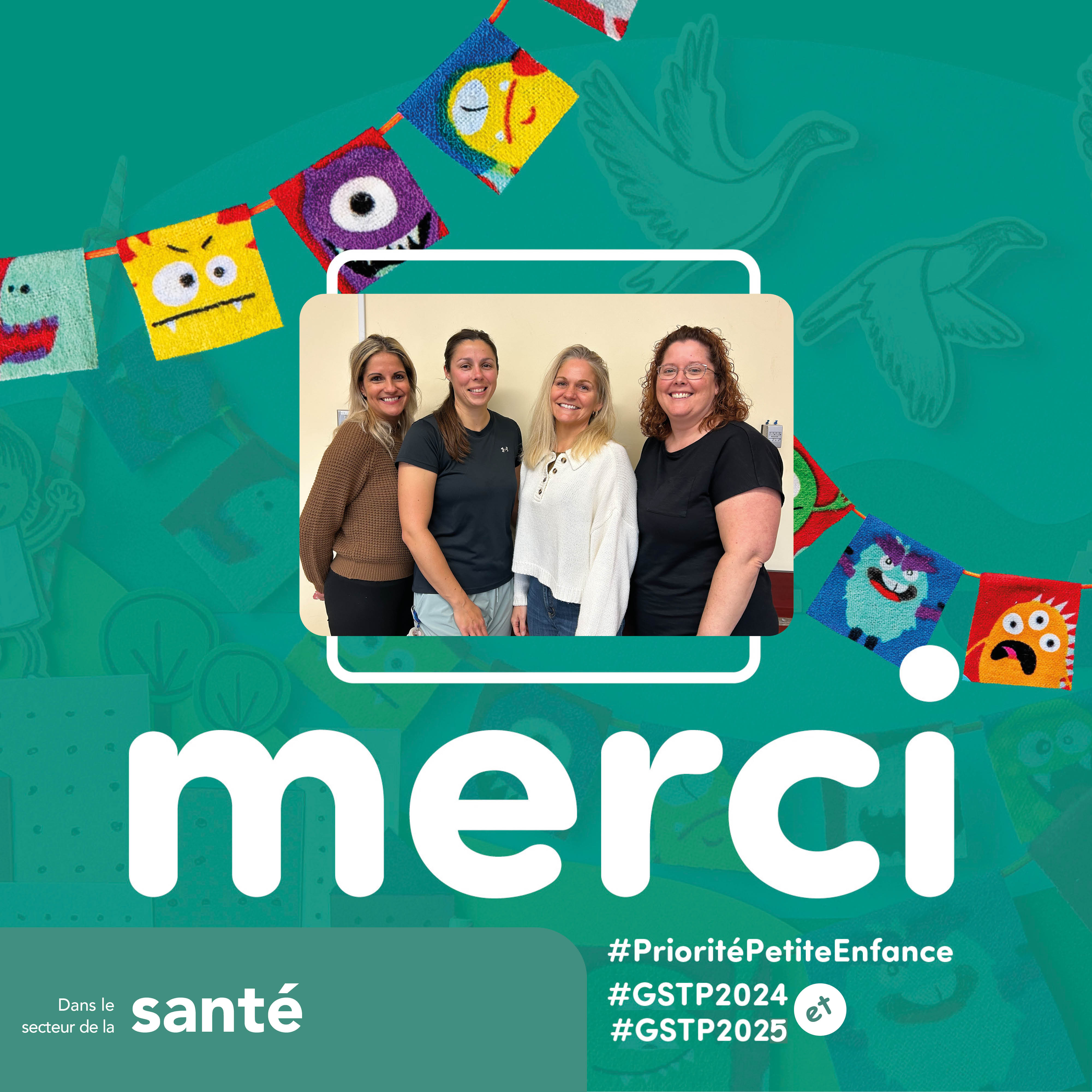 On profite donc de la Grande semaine des tout-petits pour vous dire un gros MERCI Christine, Jessica, Mélissa et Mélanie pour votre dynamisme et votre dévouement!