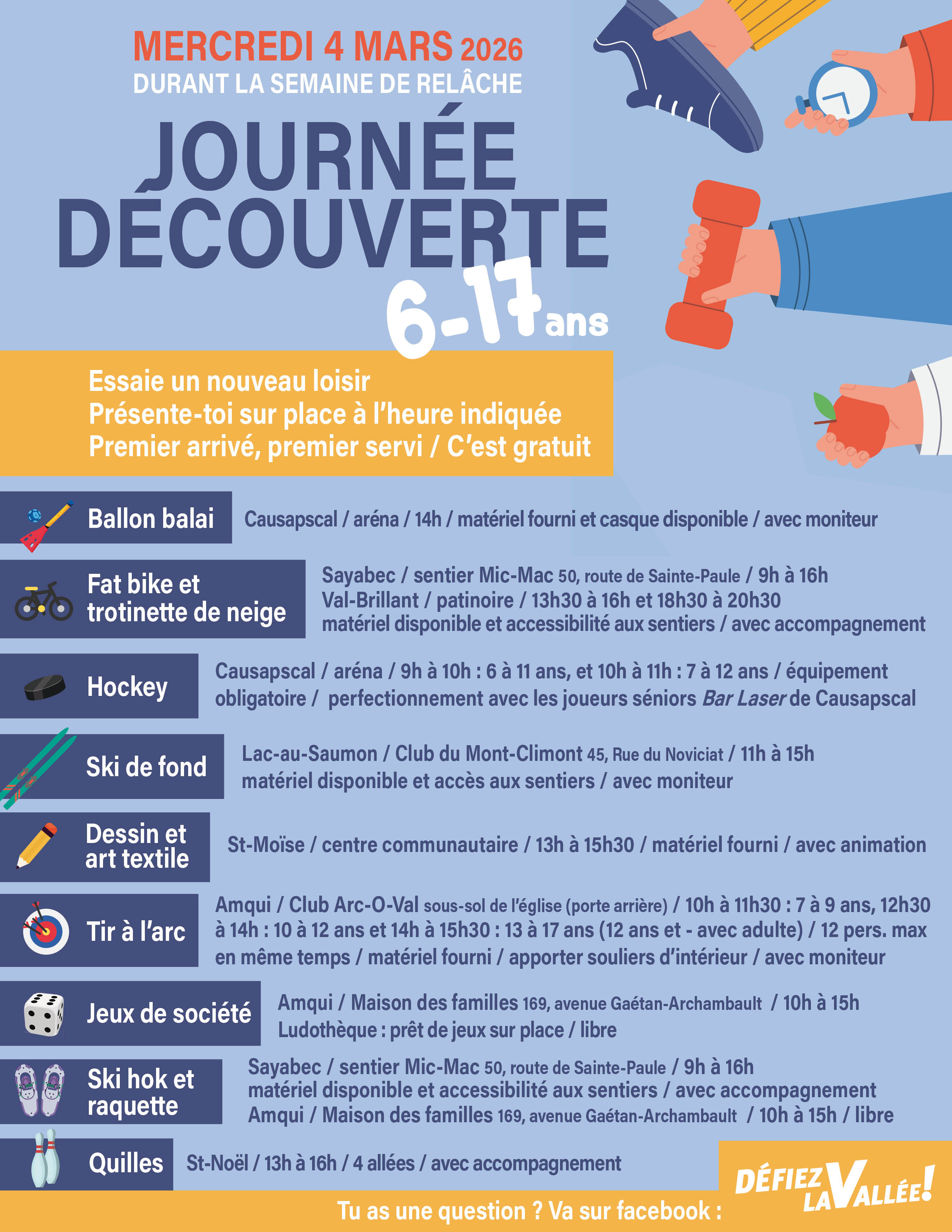 Avec l'interdiction de faire des rassemblements, les activités familiales ont été adaptées et la semaine de relâche a proposée à la population un Bingo/défi avec prix de participation. Le concept à tellement reçu d'éloges que le comité organisateur, Défiez la Vallée, a gardé le concept!
