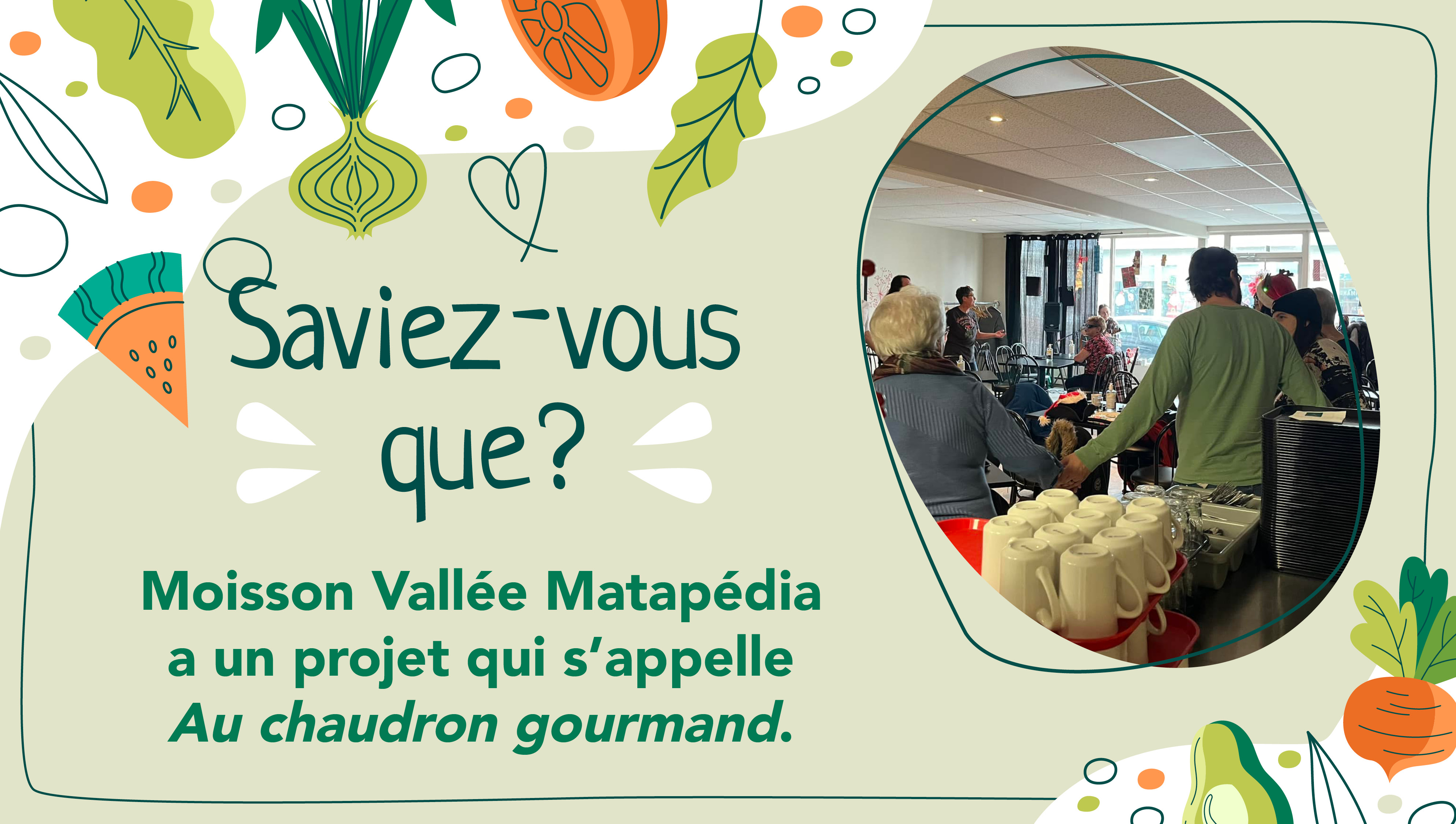 Au Chaudron gourmand, c’est un service de repas complet offert gratuitement aux citoyens de la région, tous les mercredis de 11h30 à 13h. Ce service est ouvert à tous. Il vise à favoriser le rassemblement de tous autour d’un bon repas! Contribution volontaire possible pour soutenir l’organisme selon votre situation financière!