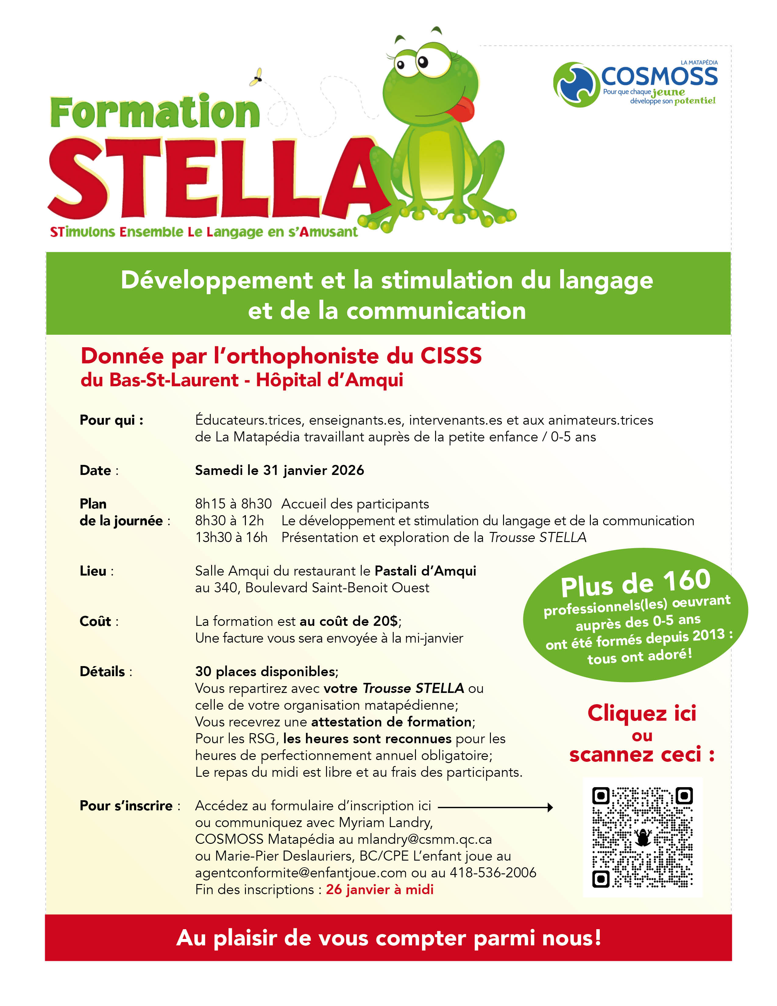 - Depuis décembre 2013, dans la Matapédia, la formation STELLA a été donnée à plus de 150 participants travaillant auprès de la petite enfance dans la vallée, en provenance de service de garde, d'organismes communautaires en petite enfance, des réseaux de la santé et du préscolaire afin de favoriser la stimulation du langage et le dépistage précoce. Les intervenantes et les éducatrices comprennent mieux le développement du langage et se sentent plus outillées.