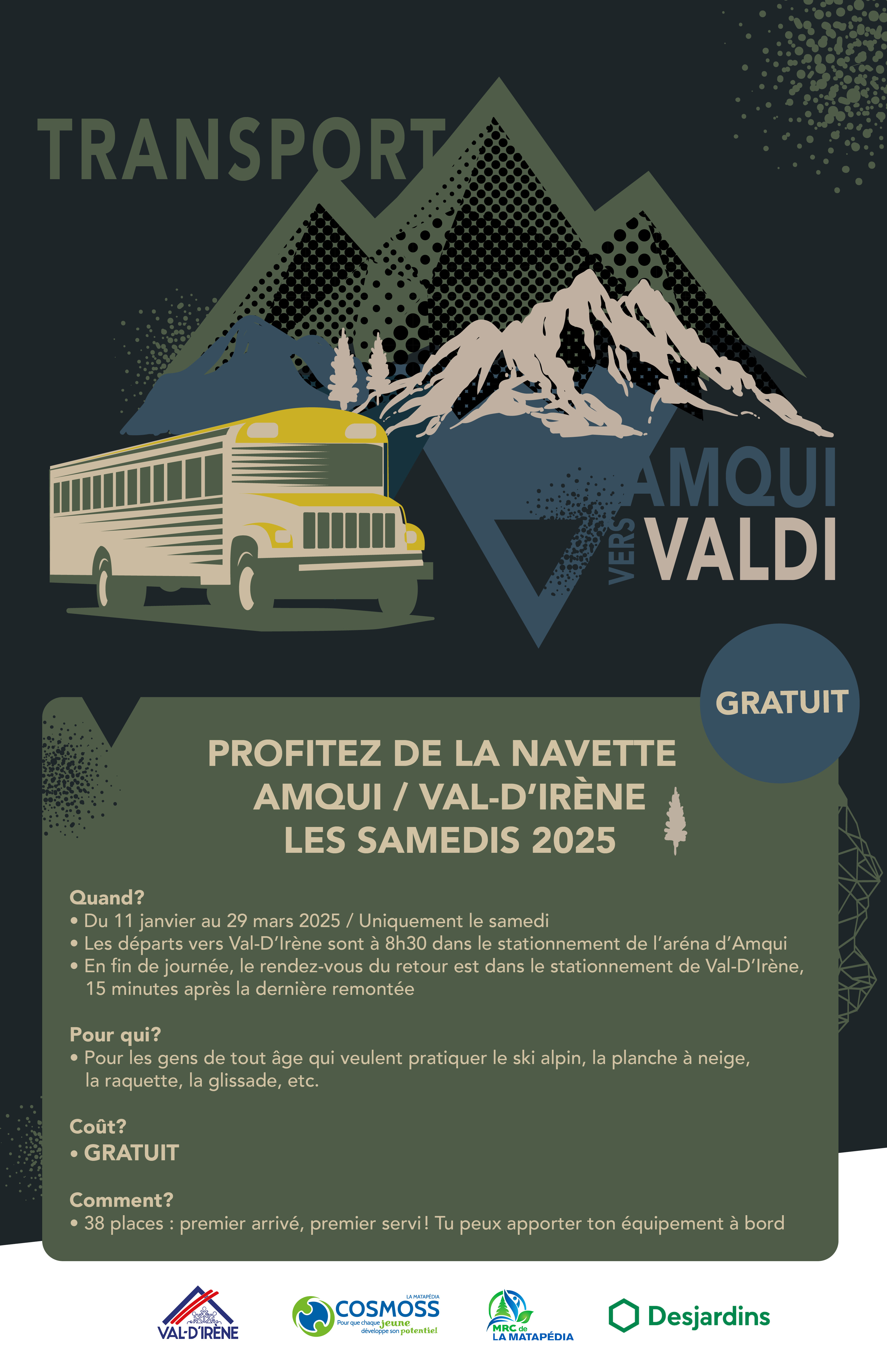 En octobre 2023, le Parc régional de Val-D'Irène, la MRC et COSMOSS Matpédia ont voulu connaître l’intérêt des adultes et des adolescents, ainsi que leurs parents, pour la mise en place d’une navette et ce, dès l'hiver 2024 !